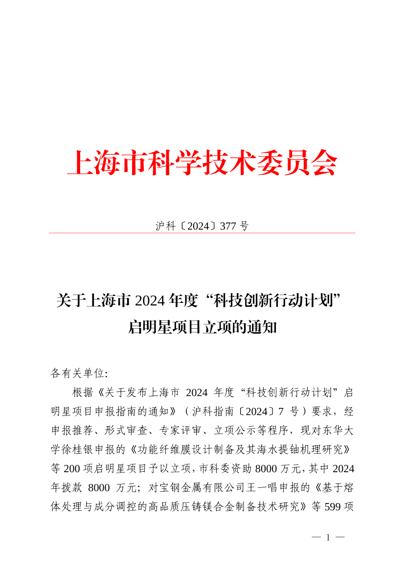 根据《关于发布上海市2024年度“科技创新行动计划”启明星项目申报指南的通知》(沪科指南〔2024〕7号)要求,经申报推荐、形式审查、专家评审、立项公示等程序,现对东华大学徐桂银申报的《功能纤维膜设计制备及其海水提铀机理研究》等200项启明星项目予以立项,市科委资助8000万元,其中2024年拨款8000万元;对宝钢金属有限公司王一唱申报的《基于熔体处理与成分调控的高品质压铸镁合金制备技术研究》等599项扬帆专项项目予以立项,市科委资助11980万元,其中2024年拨款11980万元。请各项目承担单位做好项目组织实施和管理服务工作,为项目承担人员提供良好的科研环境和条件,确保按期完成项目研究任务目标。