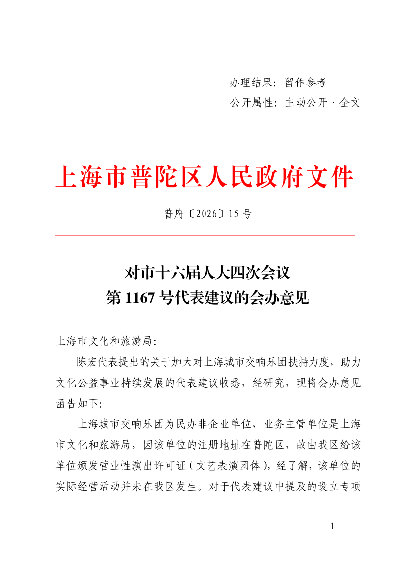 上海城市交响乐团为民办非企业单位,业务主管单位是上海市文化和旅游局,因该单位的注册地址在普陀区,故由我区给该单位颁发营业性演出许可证(文艺表演团体),经了解,该单位的实际经营活动并未在我区发生。对于代表建议中提及的设立专项扶持资金、纳入市级公益活动采购目录、支持品牌公益项目升级、搭建交流合作平台、引导社会力量参与等涉及宏观管理与发展规划的事宜,建议由市级行业主管部门统筹研究。
