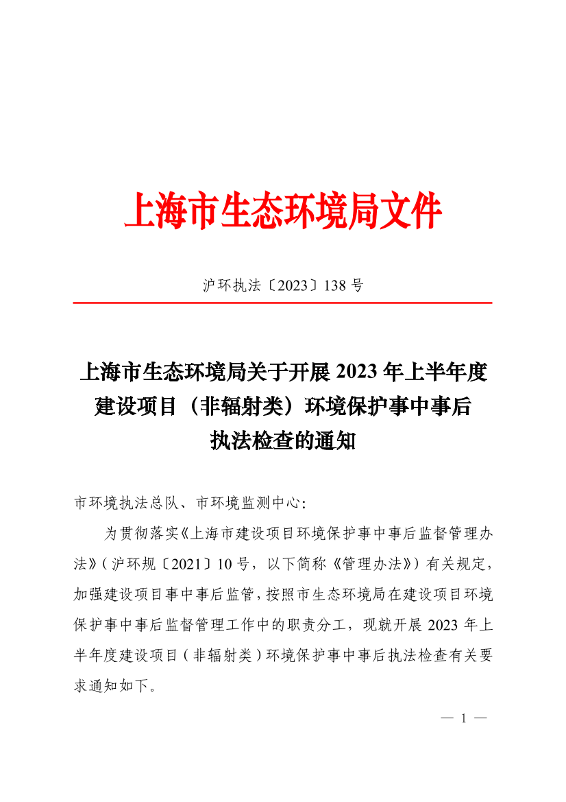 为贯彻落实《上海市建设项目环境保护事中事后监督管理办法》(沪环规〔2021〕10号,以下简称《管理办法》)有关规定,加强建设项目事中事后监管,按照市生态环境局在建设项目环境保护事中事后监督管理工作中的职责分工,现就开展2023年上半年度建设项目(非辐射类)环境保护事中事后执法检查有关要求通知如下。