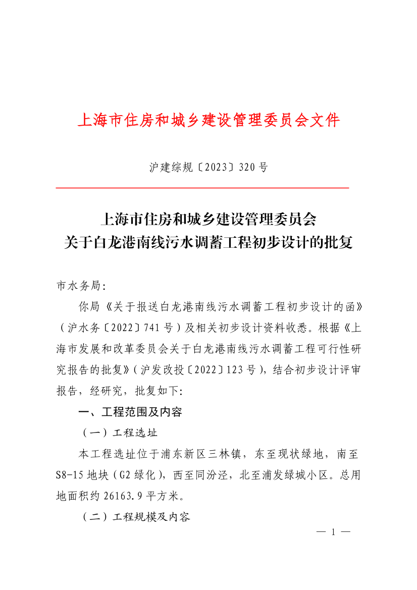 你局《关于报送白龙港南线污水调蓄工程初步设计的函》(沪水务〔2022〕741号)及相关初步设计资料收悉。根据《上海市发展和改革委员会关于白龙港南线污水调蓄工程可行性研究报告的批复》(沪发改投〔2022〕123号),结合初步设计评审报告,经研究,批复如下: