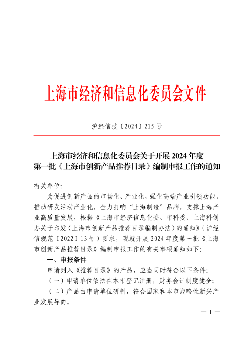 为促进创新产品的市场化、产业化,强化高端产业引领功能,推动研发活动产业化,全力打响“上海制造”品牌,支撑上海产业高质量发展,根据《上海市经济信息化委、市科委、上海科创办关于印发〈上海市创新产品推荐目录编制办法〉的通知》(沪经信规范〔2022〕13号)要求,现就开展2024年度第一批《上海市创新产品推荐目录》编制申报工作的有关事项通知如下: