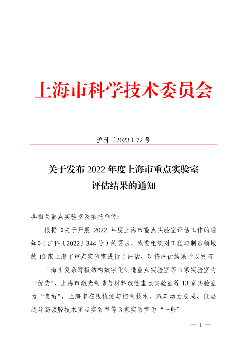 根据《关于开展2022年度上海市重点实验室评估工作的通知》(沪科〔2022〕344号)的要求,我委组织对工程与制造领域的19家上海市重点实验室进行了评估,现将评估结果予以发布。