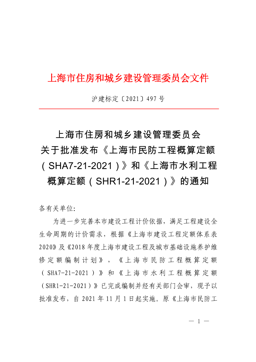 关于批准发布《上海市民防工程概算定额(SHA7-21-2021)》和《上海市水利工程概算定额(SHR1-21-2021)》的通知