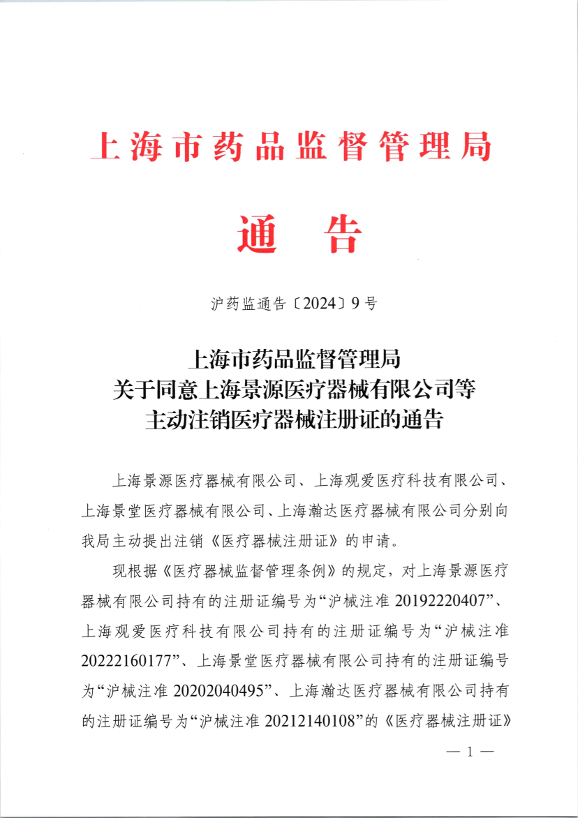 上海景源医疗器械有限公司、上海观爱医疗科技有限公司、上海景堂医疗器械有限公司、上海瀚达医疗器械有限公司分别向我局主动提出注销《医疗器械注册证》的申请。