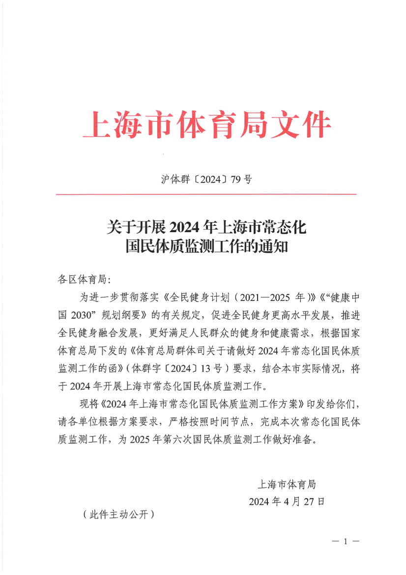 为进一步贯彻落实《全民健身计划(2021—2025年)》《“健康中国2030”规划纲要》的有关规定,促进全民健身更高水平发展,推进全民健身融合发展,更好满足人民群众的健身和健康需求,根据国家体育总局下发的《体育总局群体司关于请做好2024年常态化国民体质监测工作的函》(体群字〔2024〕13号)要求,结合本市实际情况,将于2024年开展上海市常态化国民体质监测工作。