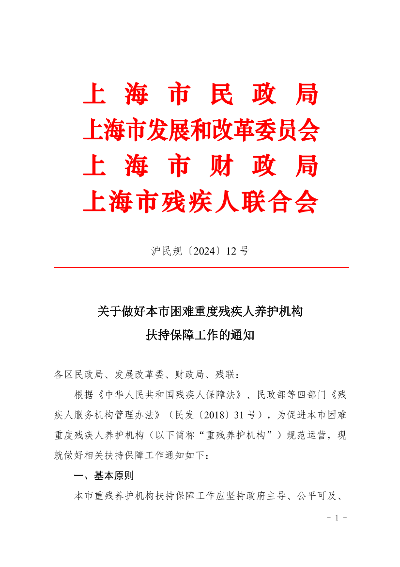 根据《中华人民共和国残疾人保障法》、民政部等四部门《残疾人服务机构管理办法》(民发〔2018〕31号),为促进本市困难重度残疾人养护机构(以下简称“重残养护机构”)规范运营,现就做好相关扶持保障工作通知如下:
