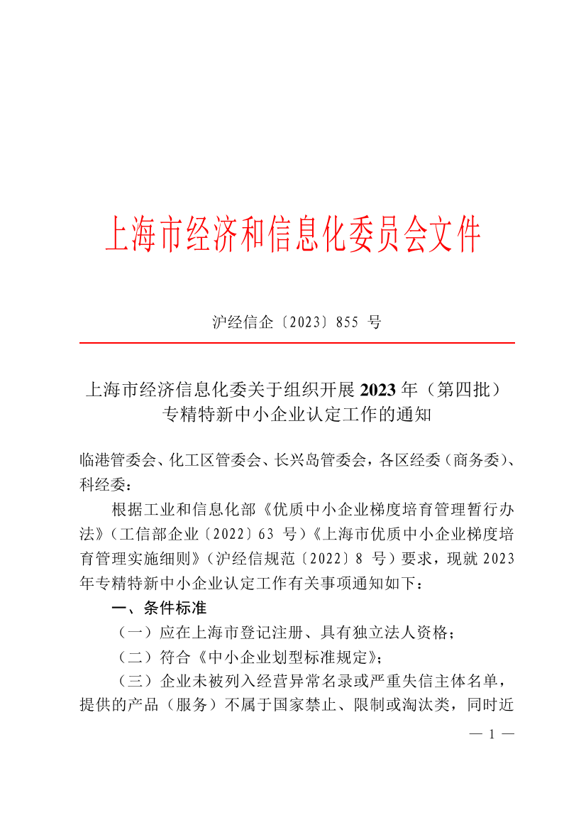 根据工业和信息化部《优质中小企业梯度培育管理暂行办法》(工信部企业〔2022〕63号)《上海市优质中小企业梯度培育管理实施细则》(沪经信规范〔2022〕8号)要求,现就2023年专精特新中小企业认定工作有关事项通知如下: