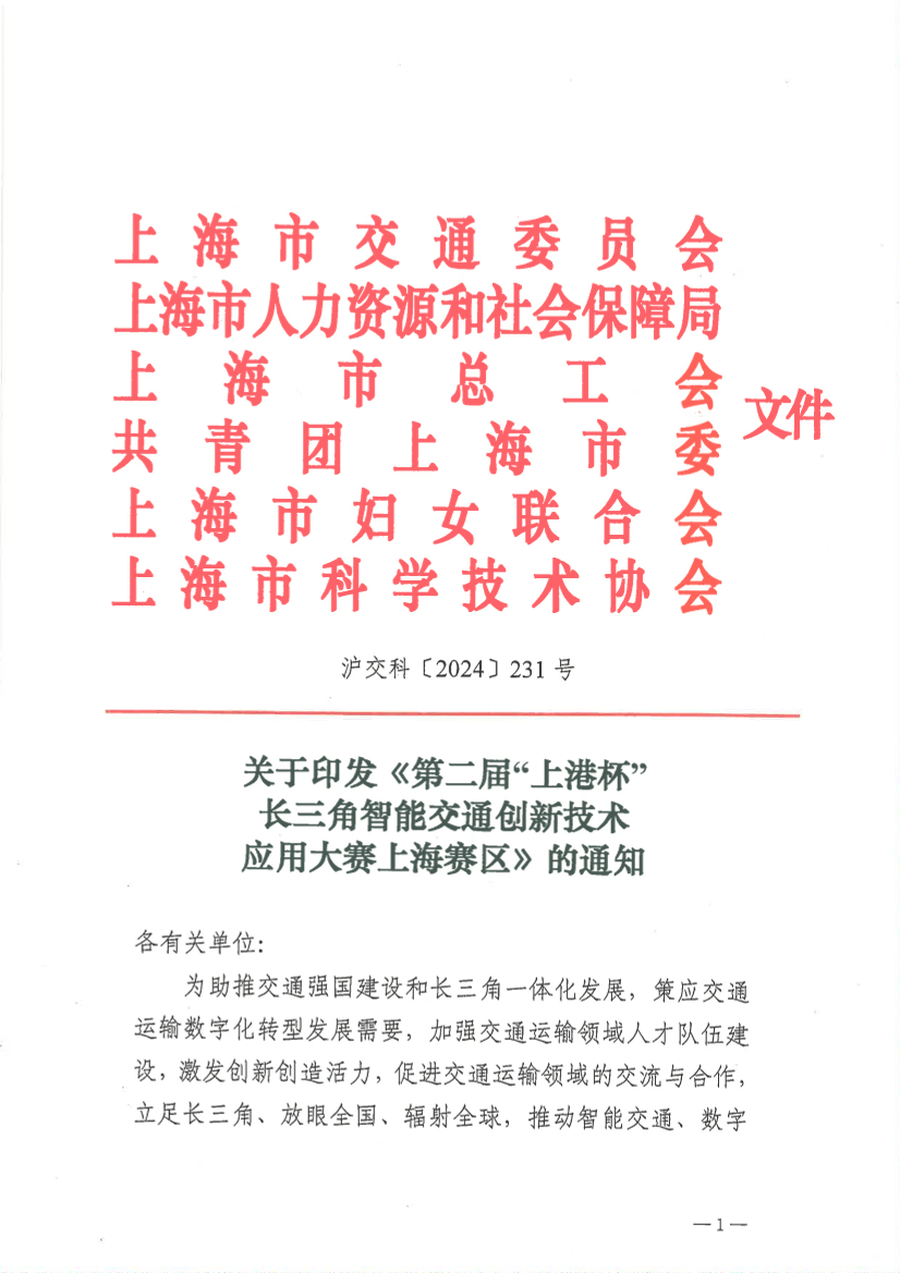 第二届“上港杯”长三角智能交通创新技术应用大赛(上海赛区),上海赛区也列为上海市第二届“追求卓越 向未来”中青年工程师创新创业大赛的智能交通赛道,本届大赛启动仪式2024年4月20日启动,10月底完成评审,2024年11月7日在进博会配套活动---第四届智能交通上海论坛上举行颁奖会议。