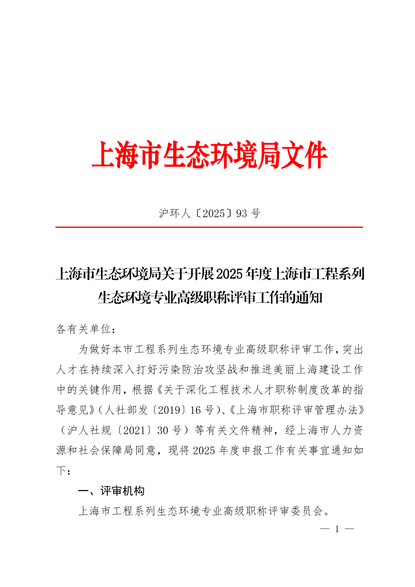 为做好本市工程系列生态环境专业高级职称评审工作,突出人才在持续深入打好污染防治攻坚战和推进美丽上海建设工作中的关键作用,根据《关于深化工程技术人才职称制度改革的指导意见》(人社部发〔2019〕16号)、《上海市职称评审管理办法》(沪人社规〔2021〕30号)等有关文件精神,经上海市人力资源和社会保障局同意,现将2025年度申报工作有关事宜通知如下: