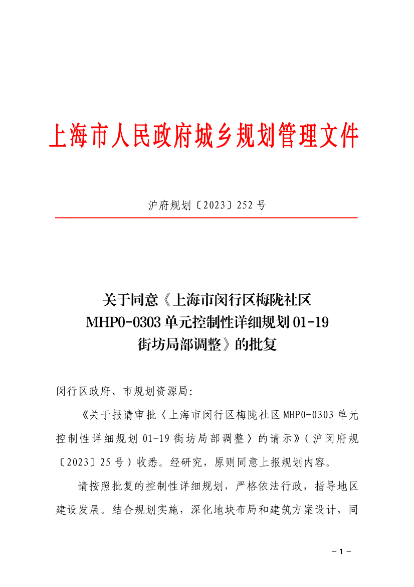 《关于报请审批〈上海市闵行区梅陇社区MHP0-0303单元控制性详细规划01-19街坊局部调整〉的请示》(沪闵府规〔2023〕25号)收悉。经研究,原则同意上报规划内容。