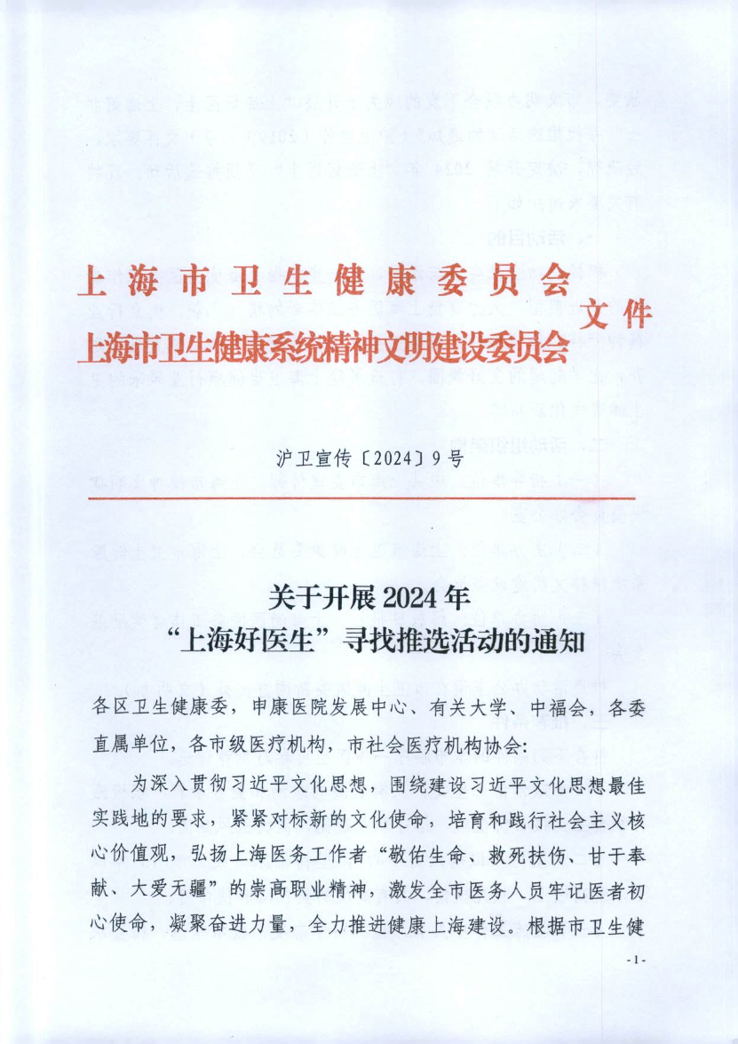(五)评选表彰。市卫生健康委将在2024年度的“中国医师节”期间,对推选出的2024年“上海好医生”和提名奖获得者进行宣传表扬。