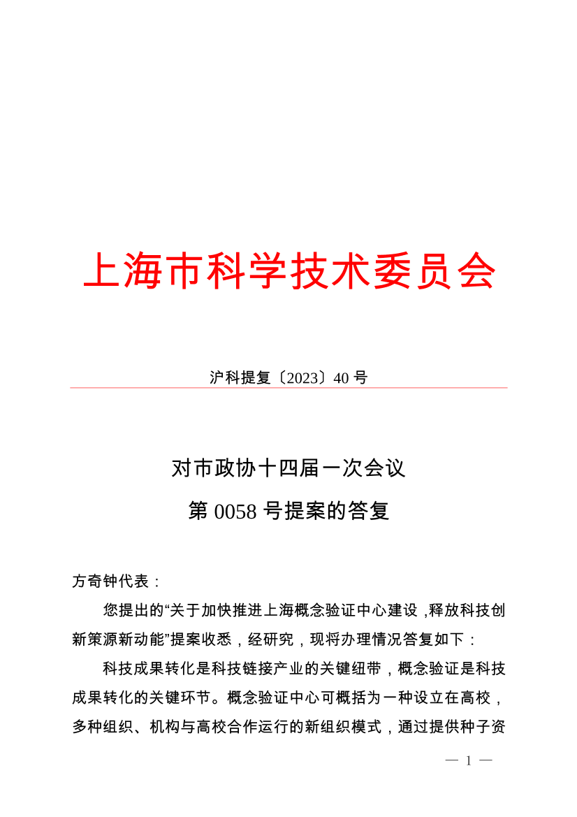 您提出的“关于加快推进上海概念验证中心建设,释放科技创新策源新动能”提案收悉,经研究,现将办理情况答复如下: