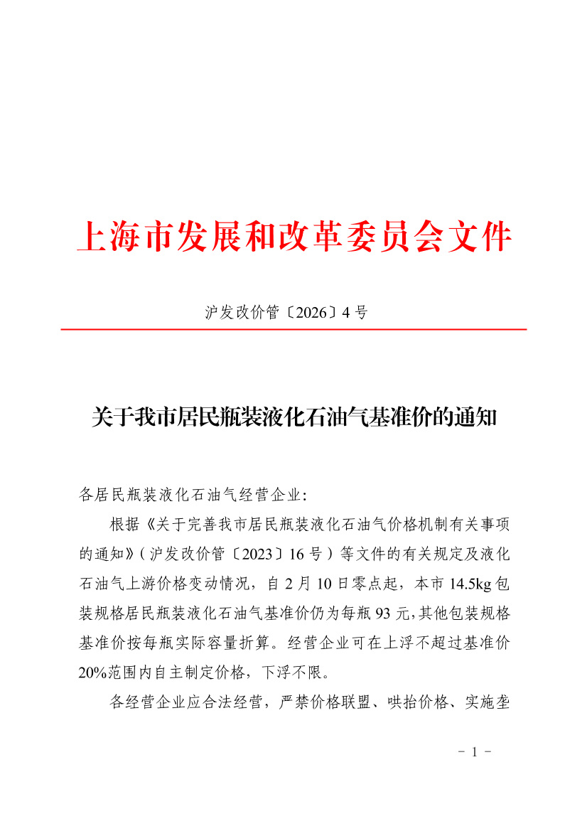 根据《关于完善我市居民瓶装液化石油气价格机制有关事项的通知》(沪发改价管〔2023〕16号)等文件的有关规定及液化石油气上游价格变动情况,自2月10日零点起,本市14.5kg包装规格居民瓶装液化石油气基准价仍为每瓶93元,其他包装规格基准价按每瓶实际容量折算。经营企业可在上浮不超过基准价20%范围内自主制定价格,下浮不限。