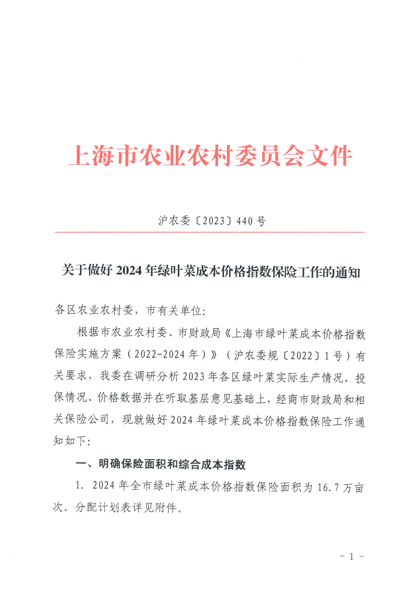 根据市农业农村委、市财政局《上海市绿叶菜成本价格指数保险实施方案(2022-2024年)》(沪农委规〔2022〕1号)有关要求,我委在调研分析2023年各区绿叶菜实际生产情况、投保情况、价格数据并在听取基层意见基础上,经商市财政局和相关保险公司,现就做好2024年绿叶菜成本价格指数保险工作通知如下: