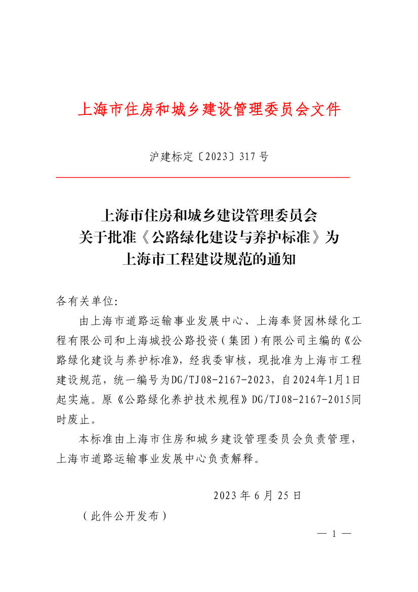 由上海市道路运输事业发展中心、上海奉贤园林绿化工程有限公司和上海城投公路投资(集团)有限公司主编的《公路绿化建设与养护标准》,经我委审核,现批准为上海市工程建设规范,统一编号为DG/TJ08-2167-2023,自2024年1月1日起实施。原《公路绿化养护技术规程》DG/TJ08-2167-2015同时废止。