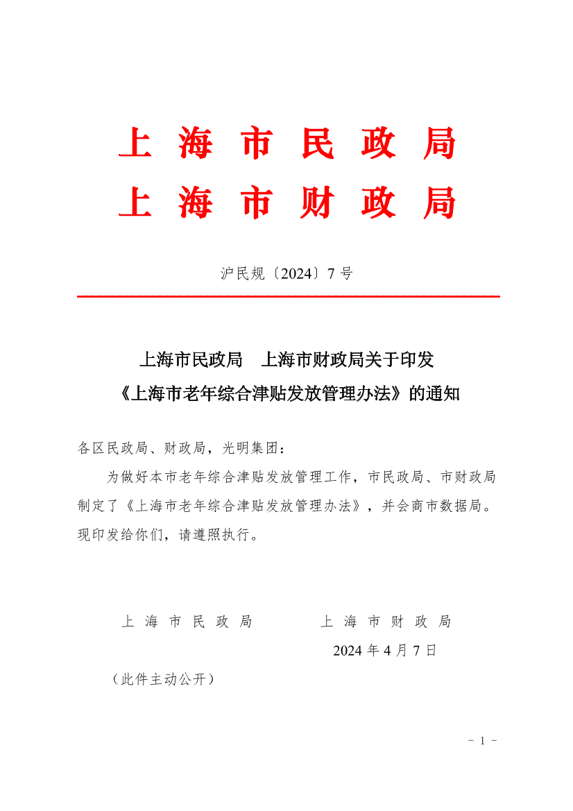 为做好本市老年综合津贴发放管理工作,市民政局、市财政局制定了《上海市老年综合津贴发放管理办法》,并会商市数据局。现印发给你们,请遵照执行。