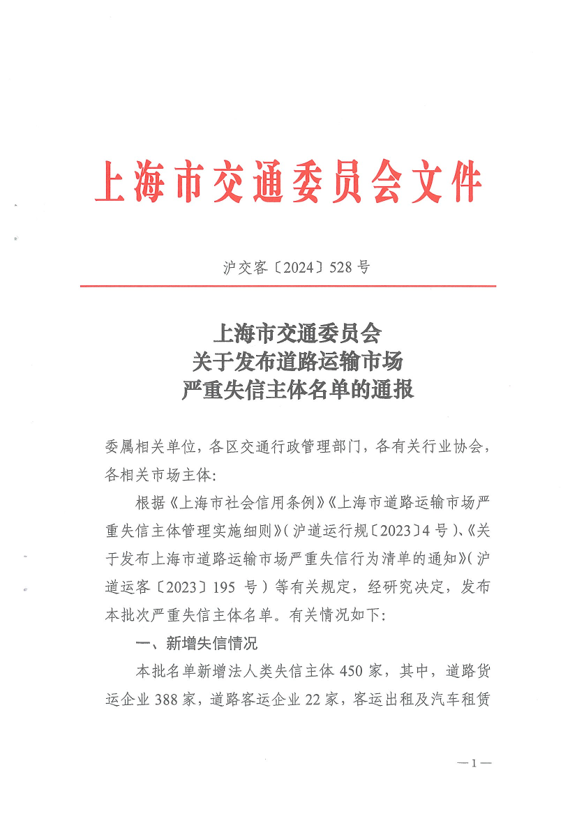 根据《上海市社会信用条例》《上海市道路运输市场严重失信主体管理实施细则》(沪道运行规〔2023〕4号)、《关于发布上海市道路运输市场严重失信行为清单的通知》(沪道运客〔2023〕195号)等有关规定,经研究决定,发布本批次严重失信主体名单。有关情况如下: