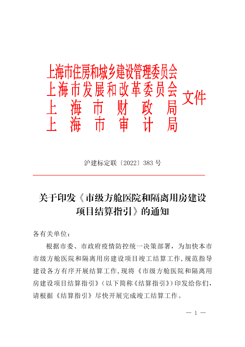 根据市委、市政府疫情防控统一决策部署,为加快本市市级方舱医院和隔离用房建设项目竣工结算工作,规范指导建设各方有序开展结算工作,现将《市级方舱医院和隔离用房建设项目结算指引》(以下简称《结算指引》)印发给你们,请根据《结算指引》尽快开展完成竣工结算工作。