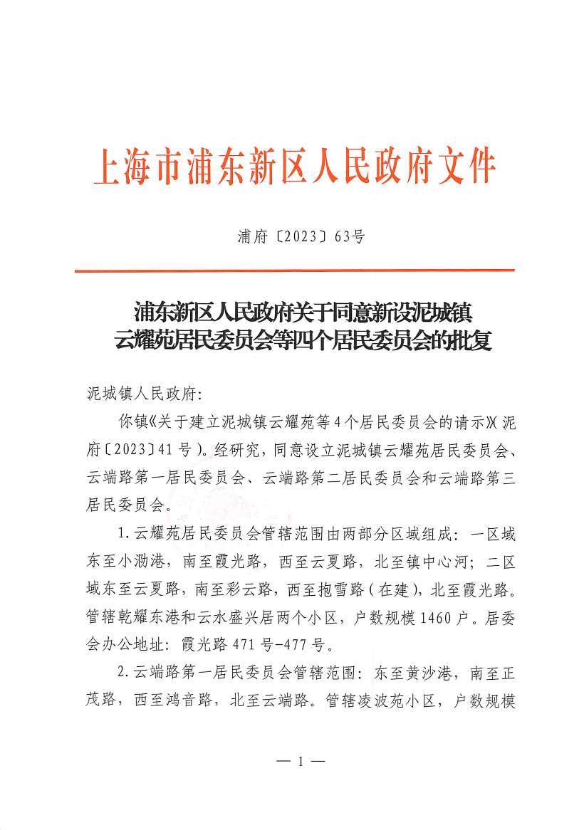 你镇《关于建立泥城镇云耀苑等4个居民委员会的请示》(泥府〔2023〕41号)。经研究,同意设立泥城镇云耀苑居民委员会、云端路第一居民委员会、云端路第二居民委员会和云端路第三居民委员会。