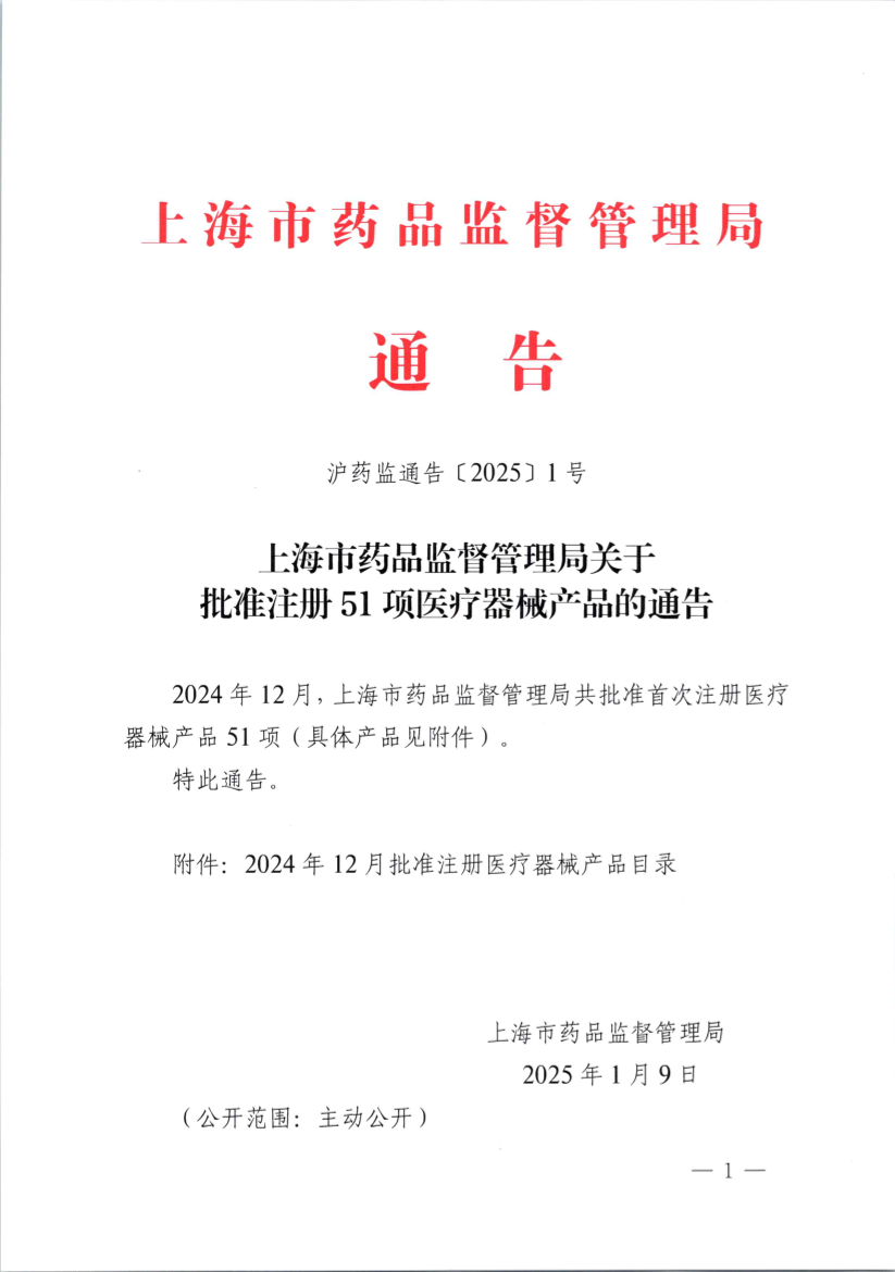2024年12月,上海市药品监督管理局共批准首次注册医疗器械产品51项(具体产品见附件)。