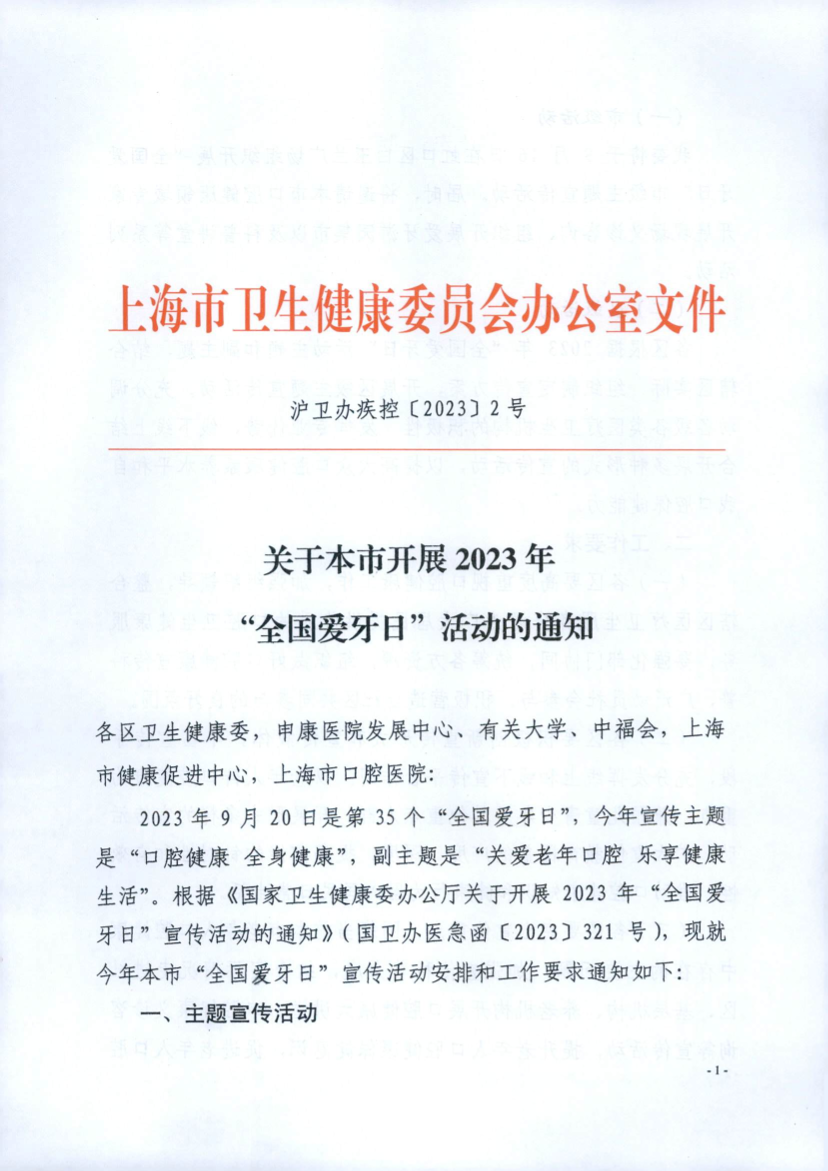 2023年9月20日是第35个“全国爱牙日”,今年宣传主题是“口腔健康 全身健康”,副主题是“关爱老年口腔 乐享健康生活”。根据《国家卫生健康委办公厅关于开展2023年“全国爱牙日”宣传活动的通知》(国卫办医急函〔2023〕321号),现就今年本市“全国爱牙日”宣传活动安排和工作要求通知如下: