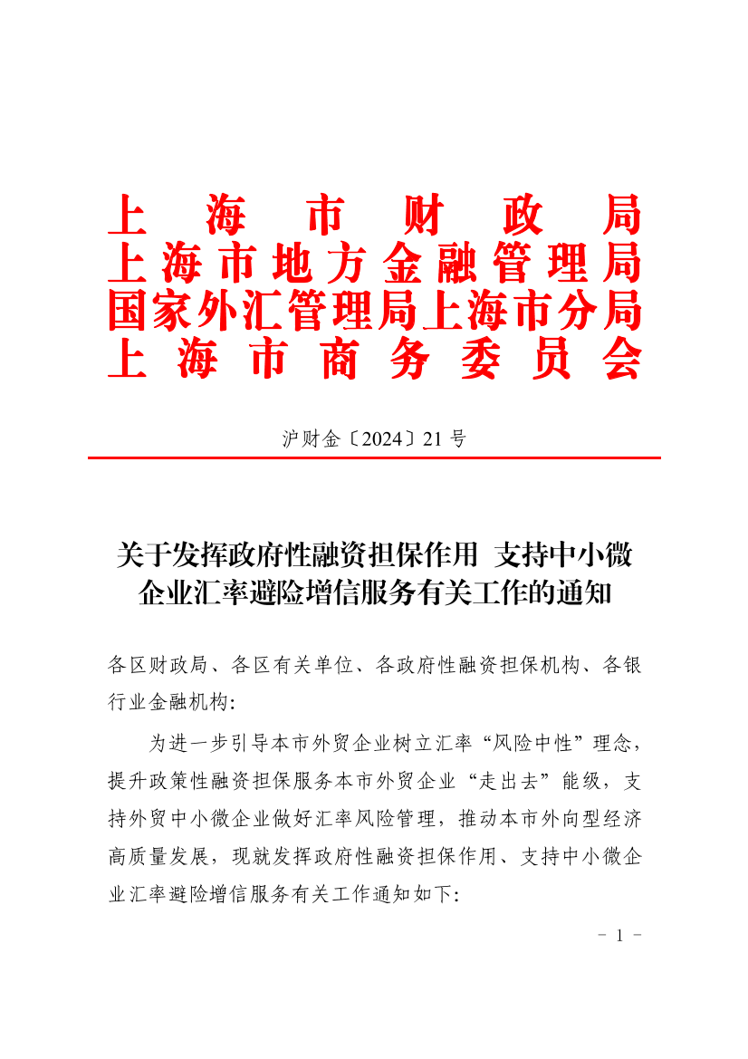 为进一步引导本市外贸企业树立汇率“风险中性”理念,提升政策性融资担保服务本市外贸企业“走出去”能级,支持外贸中小微企业做好汇率风险管理,推动本市外向型经济高质量发展,现就发挥政府性融资担保作用、支持中小微企业汇率避险增信服务有关工作通知如下: