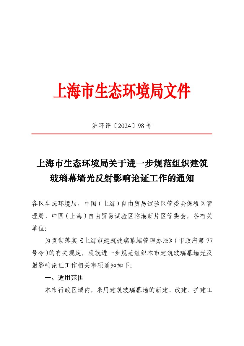 为贯彻落实《上海市建筑玻璃幕墙管理办法》(市政府第77号令)的有关规定,现就进一步规范组织本市建筑玻璃幕墙光反射影响论证工作相关事项通知如下: