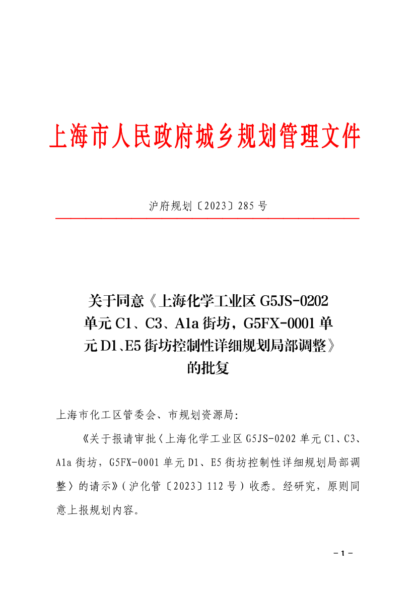 《关于报请审批〈上海化学工业区G5JS-0202单元C1、C3、A1a街坊,G5FX-0001单元D1、E5街坊控制性详细规划局部调整〉的请示》(沪化管〔2023〕112号)收悉。经研究,原则同意上报规划内容。
