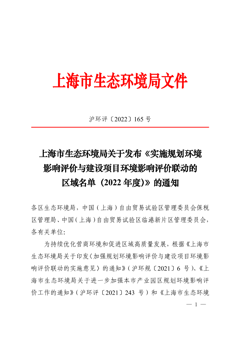 为持续优化营商环境和促进区域高质量发展,根据《上海市生态环境局关于印发〈加强规划环境影响评价与建设项目环境影响评价联动的实施意见〉的通知》(沪环规〔2021〕6号)、《上海市生态环境局关于进一步加强本市产业园区规划环境影响评价工作的通知》(沪环评〔2021〕243号)和《上海市生态环境局关于开展2022年度产业园区“三线一单”和规划环评实施情况跟踪评估工作的通知》(沪环评〔2022〕36号)的有关要求,现发布《实施规划环境影响评价与建设项目环境影响评价联动的区域名单(2022年度)》(见附件)。
