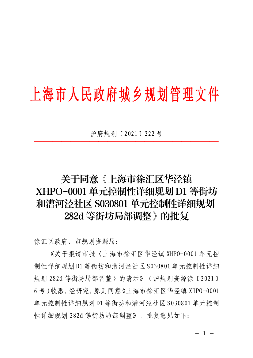 《关于报请审批〈上海市徐汇区华泾镇XHPO-0001单元控制性详细规划D1等街坊和漕河泾社区S030801单元控制性详细规划282d等街坊局部调整〉的请示》(沪规划资源徐〔2021〕6号)收悉。经研究,原则同意《上海市徐汇区华泾镇XHPO-0001单元控制性详细规划D1等街坊和漕河泾社区S030801单元控制性详细规划282d等街坊局部调整》。批复意见如下: