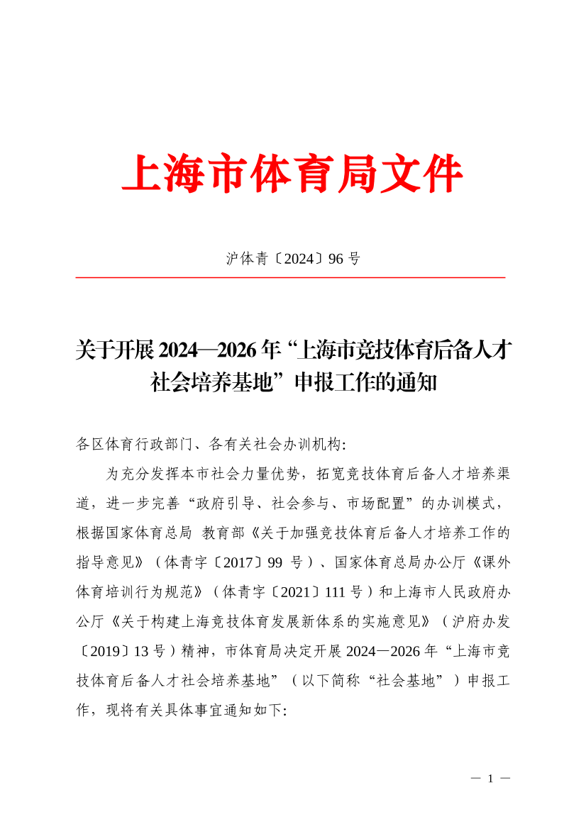 为充分发挥本市社会力量优势,拓宽竞技体育后备人才培养渠道,进一步完善“政府引导、社会参与、市场配置”的办训模式,根据国家体育总局 教育部《关于加强竞技体育后备人才培养工作的指导意见》(体青字〔2017〕99号)、国家体育总局办公厅《课外体育培训行为规范》(体青字〔2021〕111号)和上海市人民政府办公厅《关于构建上海竞技体育发展新体系的实施意见》(沪府办发〔2019〕13号)精神,市体育局决定开展2024—2026年“上海市竞技体育后备人才社会培养基地”(以下简称“社会基地”)申报工作,现将有关具体事宜通知如下: