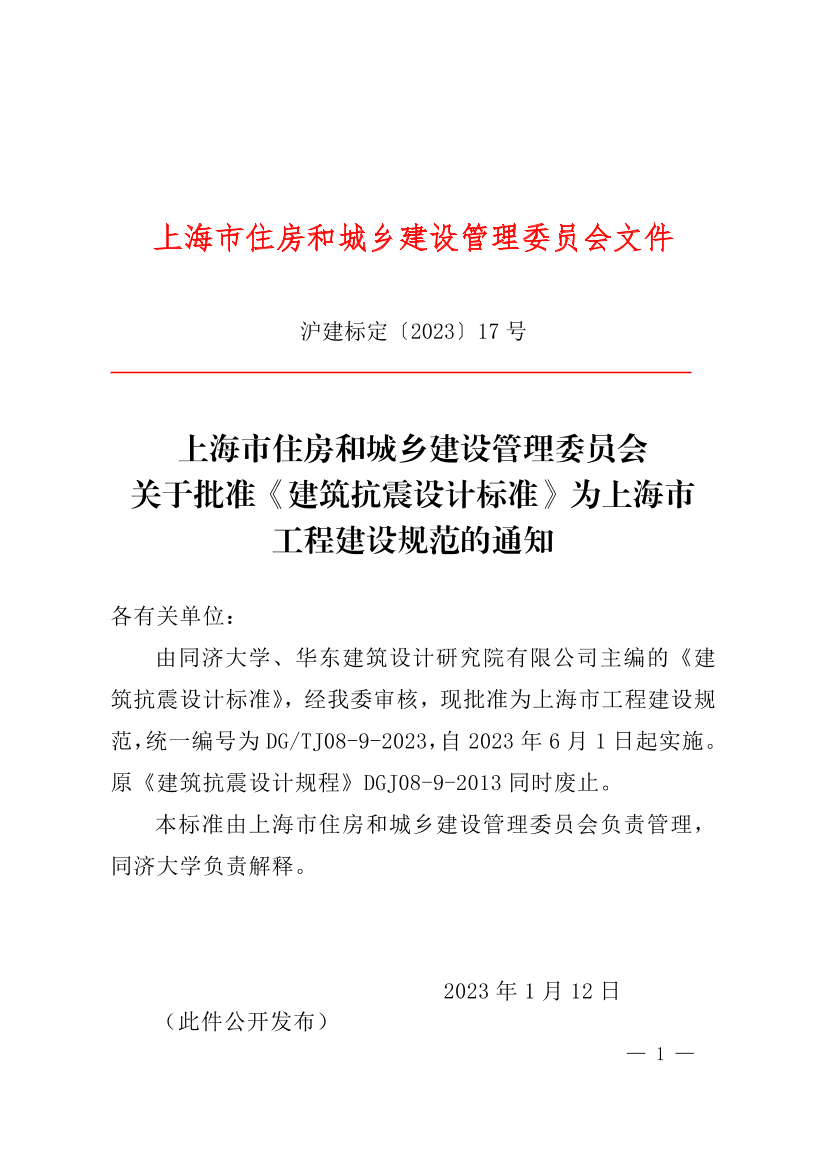 由同济大学、华东建筑设计研究院有限公司主编的《建筑抗震设计标准》,经我委审核,现批准为上海市工程建设规范,统一编号为DG/TJ08-9-2023,自2023年6月1日起实施。原《建筑抗震设计规程》DGJ08-9-2013同时废止。