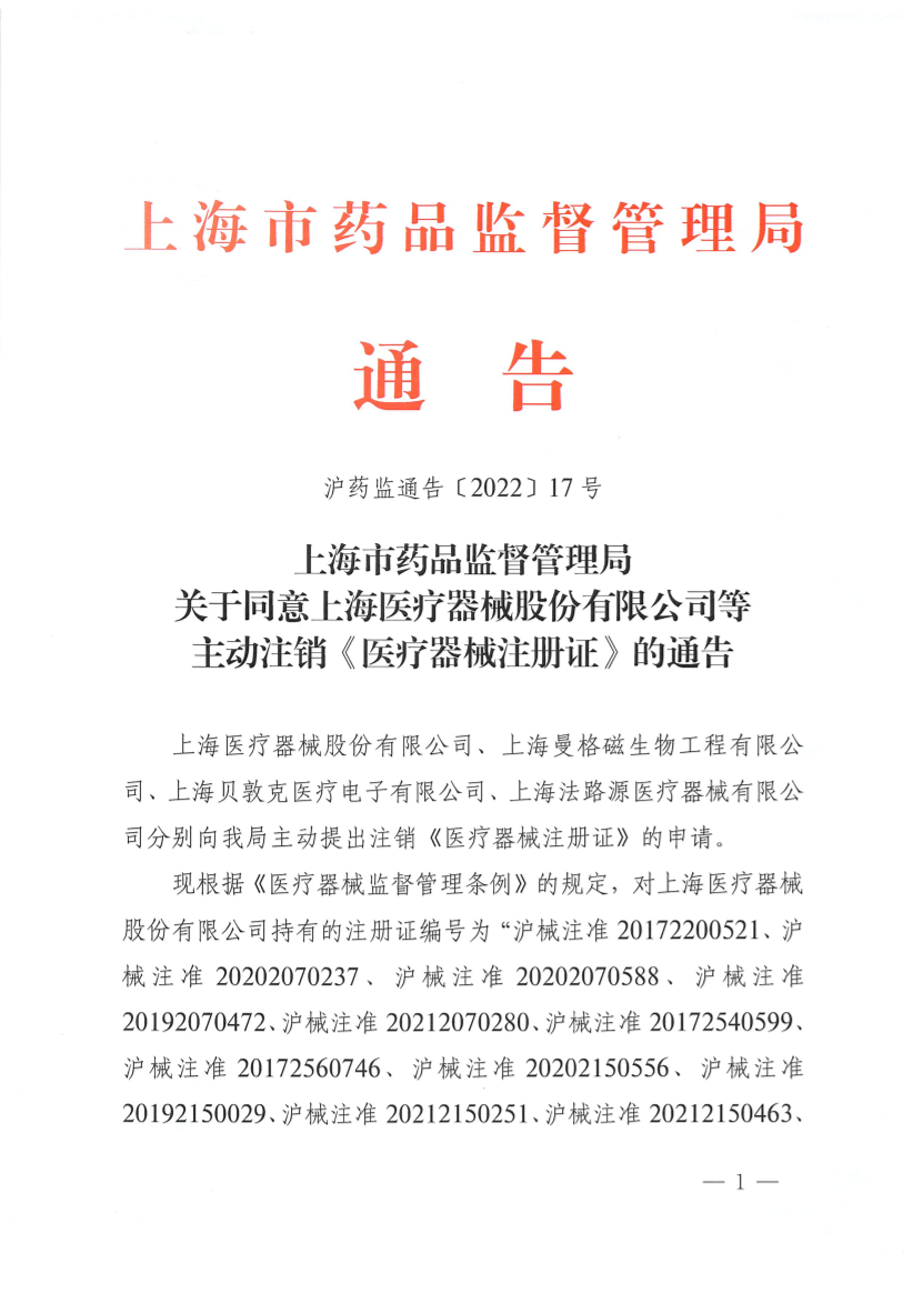 现根据《医疗器械监督管理条例》的规定,对上海医疗器械股份有限公司持有的注册证编号为“沪械注准20172200521、沪械注准20202070237、沪械注准20202070588、沪械注准20192070472、沪械注准20212070280、沪械注准20172540599、沪械注准20172560746、沪械注准20202150556、沪械注准20192150029、沪械注准20212150251、沪械注准20212150463、沪械注准20212150464、沪械注准20172540670、沪械注准20182540268、沪械注准20202010501、沪械注准20212010389”的《医疗器械注册证》、上海曼格磁生物工程有限公司持有的注册证编号为“沪械注准20182260159、沪械注准20182260160”、上海贝敦克医疗电子有限公司持有的注册证编号为“沪械注准20192140463”、上海法路源医疗器械有限公司持有的注册证编号为“沪械注准20192180334”的《医疗器械注册证》依法予以注销(清单详见附件)。