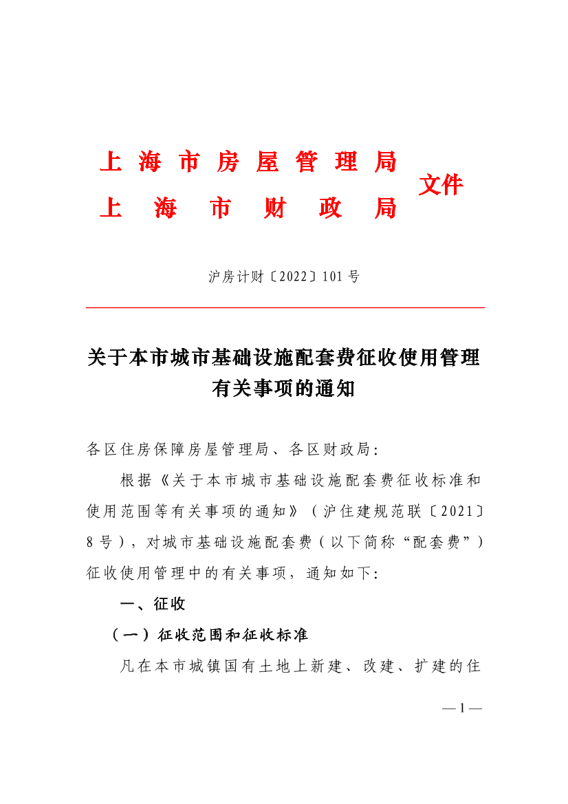 根据《关于本市城市基础设施配套费征收标准和使用范围等有关事项的通知》(沪住建规范联〔2021〕8号),对城市基础设施配套费(以下简称“配套费”)征收使用管理中的有关事项,通知如下: