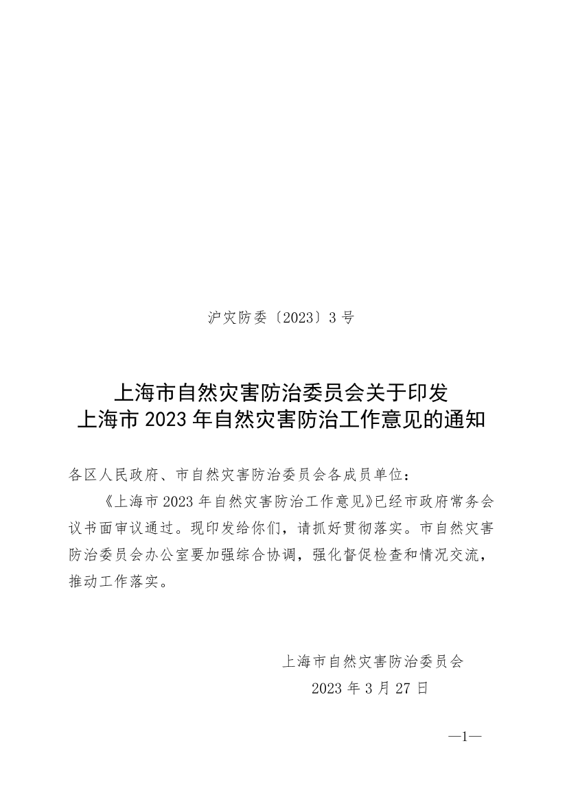 《上海市2023年自然灾害防治工作意见》已经市政府常务会议书面审议通过。现印发给你们,请抓好贯彻落实。市自然灾害防治委员会办公室要加强综合协调,强化督促检查和情况交流,推动工作落实。