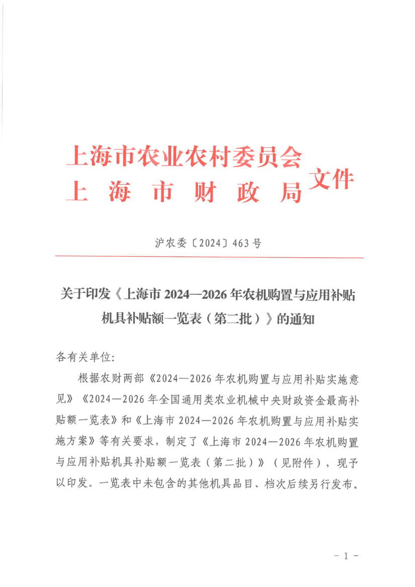 根据农财两部《2024—2026年农机购置与应用补贴实施意见》《2024—2026年全国通用类农业机械中央财政资金最高补贴额一览表》和《上海市2024—2026年农机购置与应用补贴实施方案》等有关要求,制定了《上海市2024—2026年农机购置与应用补贴机具补贴额一览表(第二批)》(见附件),现予以印发。一览表中未包含的其他机具品目、档次后续另行发布。