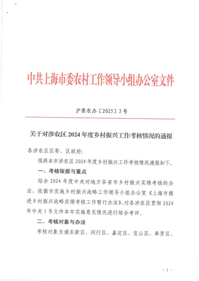 结合2024年度中央对地方各省市乡村振兴实绩考核的办法,依据市实施乡村振兴战略工作领导小组办公室《上海市推进乡村振兴战略实绩考核工作暂行办法》,对各涉农区贯彻2024年中央1号文件本市实施意见情况进行综合考评。