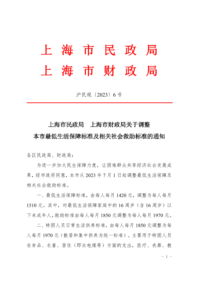 一、最低生活保障标准,由每人每月1420元,调整为每人每月1510元。其中,对最低生活保障家庭中的16周岁(含16周岁)以下未成年人,救助标准由每人每月1850元调整为每人每月1970元。