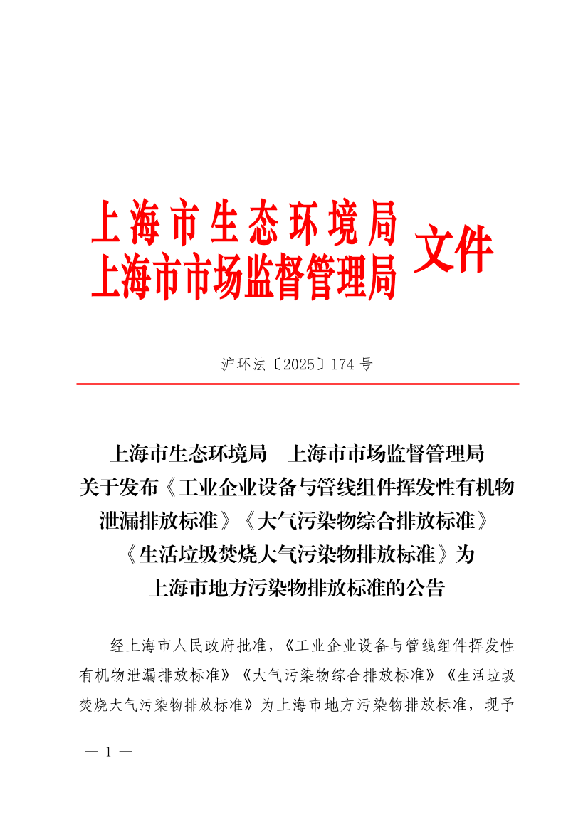 经上海市人民政府批准,《工业企业设备与管线组件挥发性有机物泄漏排放标准》《大气污染物综合排放标准》《生活垃圾焚烧大气污染物排放标准》为上海市地方污染物排放标准,现予以发布。批准发布的上海市地方污染物排放标准目录详见附件。