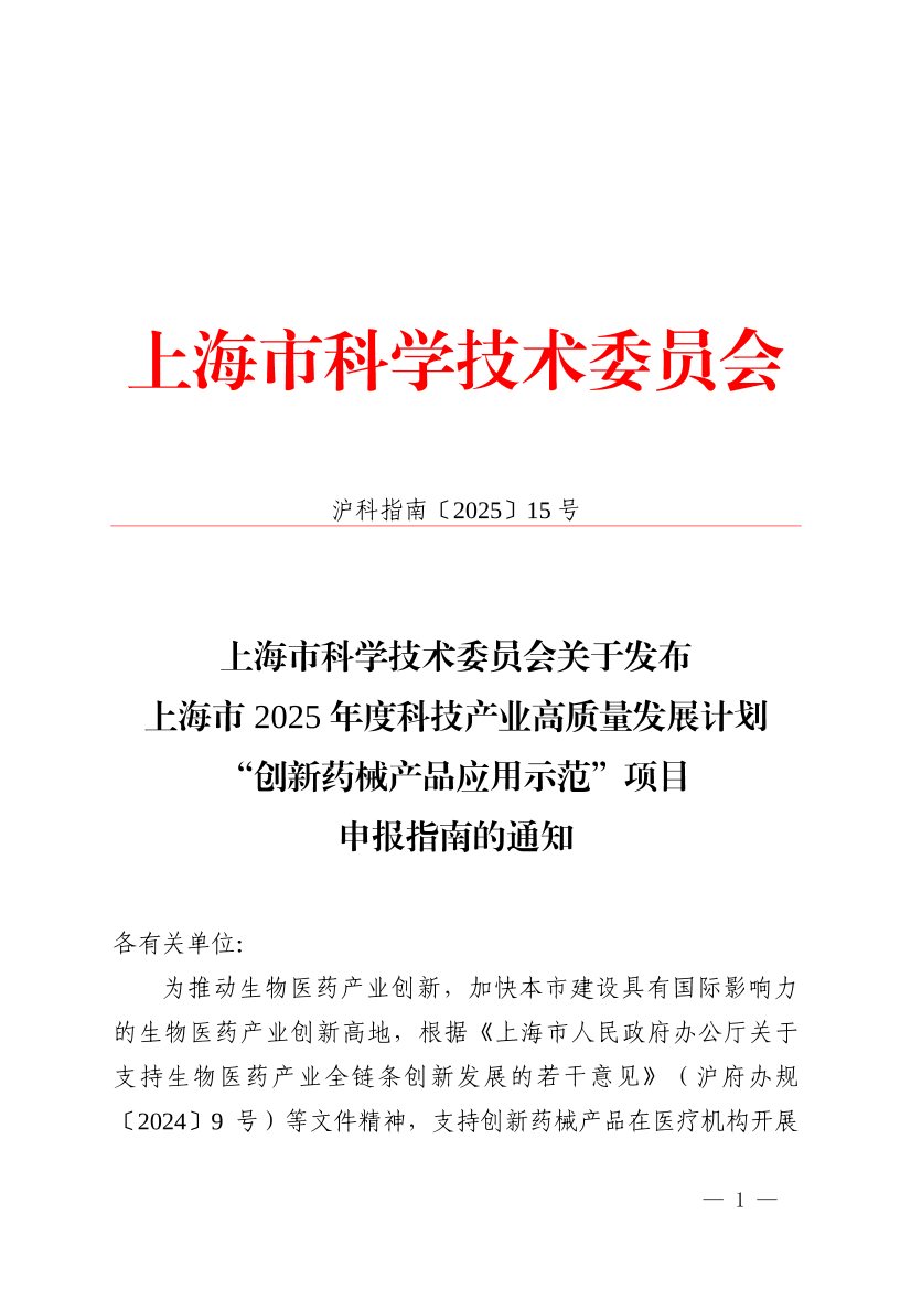 为推动生物医药产业创新,加快本市建设具有国际影响力的生物医药产业创新高地,根据《上海市人民政府办公厅关于支持生物医药产业全链条创新发展的若干意见》(沪府办规〔2024〕9号)等文件精神,支持创新药械产品在医疗机构开展示范应用与推广,上海市科学技术委员会发布2025年度科技产业高质量发展计划“创新药械产品应用示范”项目申报指南。