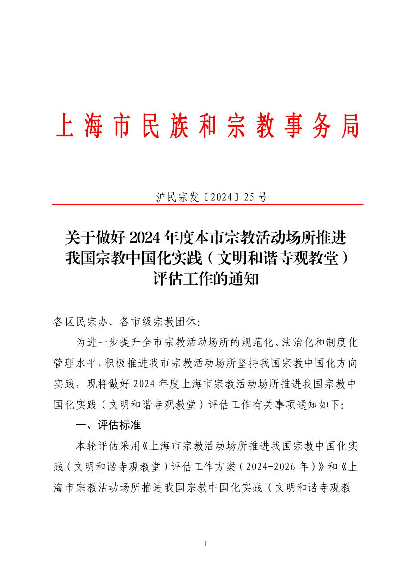 为进一步提升全市宗教活动场所的规范化、法治化和制度化管理水平,积极推进我市宗教活动场所坚持我国宗教中国化方向实践,现将做好2024年度上海市宗教活动场所推进我国宗教中国化实践(文明和谐寺观教堂)评估工作有关事项通知如下:
