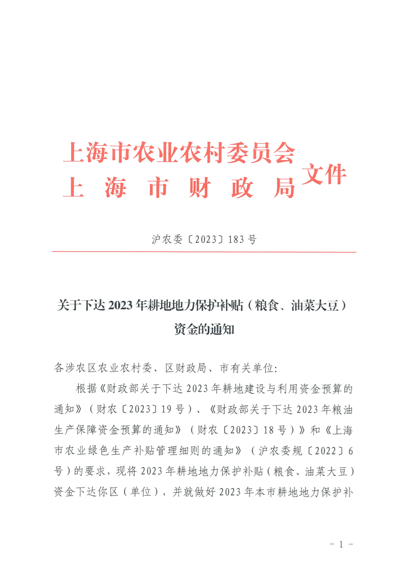 根据《财政部关于下达2023年耕地建设与利用资金预算的通知》(财农〔2023〕19号)、《财政部关于下达2023年粮油生产保障资金预算的通知》(财农〔2023〕18号)》和《上海市农业绿色生产补贴管理细则的通知》(沪农委规〔2022〕6号)的要求,现将2023年耕地地力保护补贴(粮食、油菜大豆)资金下达你区(单位),并就做好2023年本市耕地地力保护补贴发放工作有关事项通知如下: