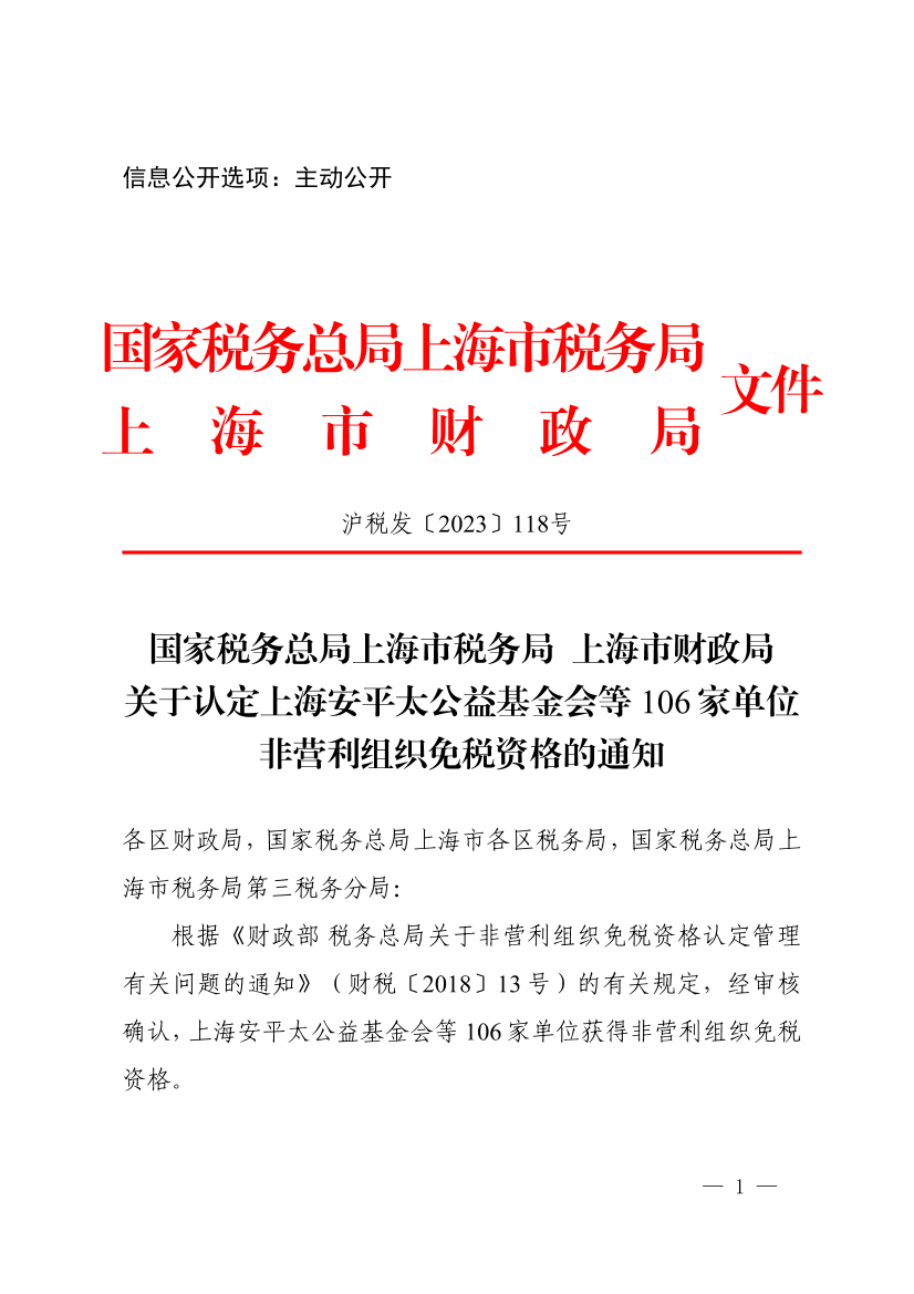 国家税务总局上海市税务局 上海市财政局关于认定上海安平太公益基金会等106家单位非营利组织免税资格的通知