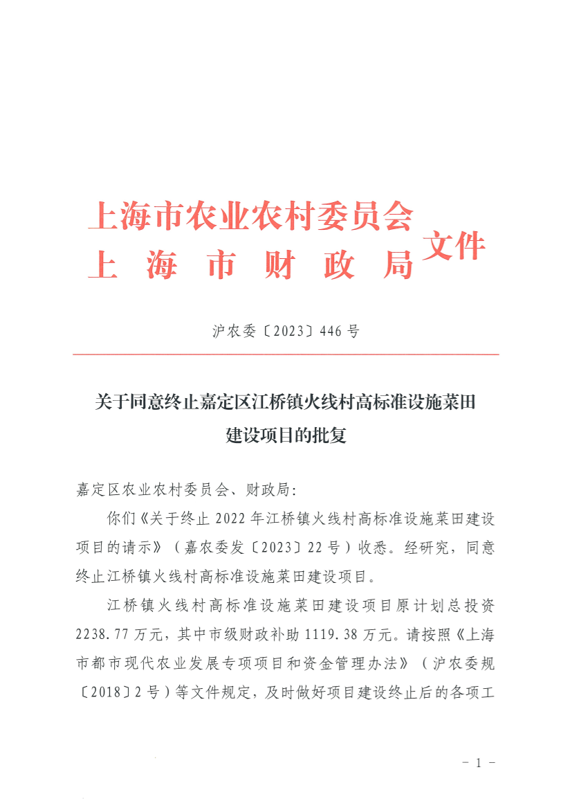 你们《关于终止2022年江桥镇火线村高标准设施菜田建设项目的请示》(嘉农委发〔2023〕22号)收悉。经研究,同意终止江桥镇火线村高标准设施菜田建设项目。