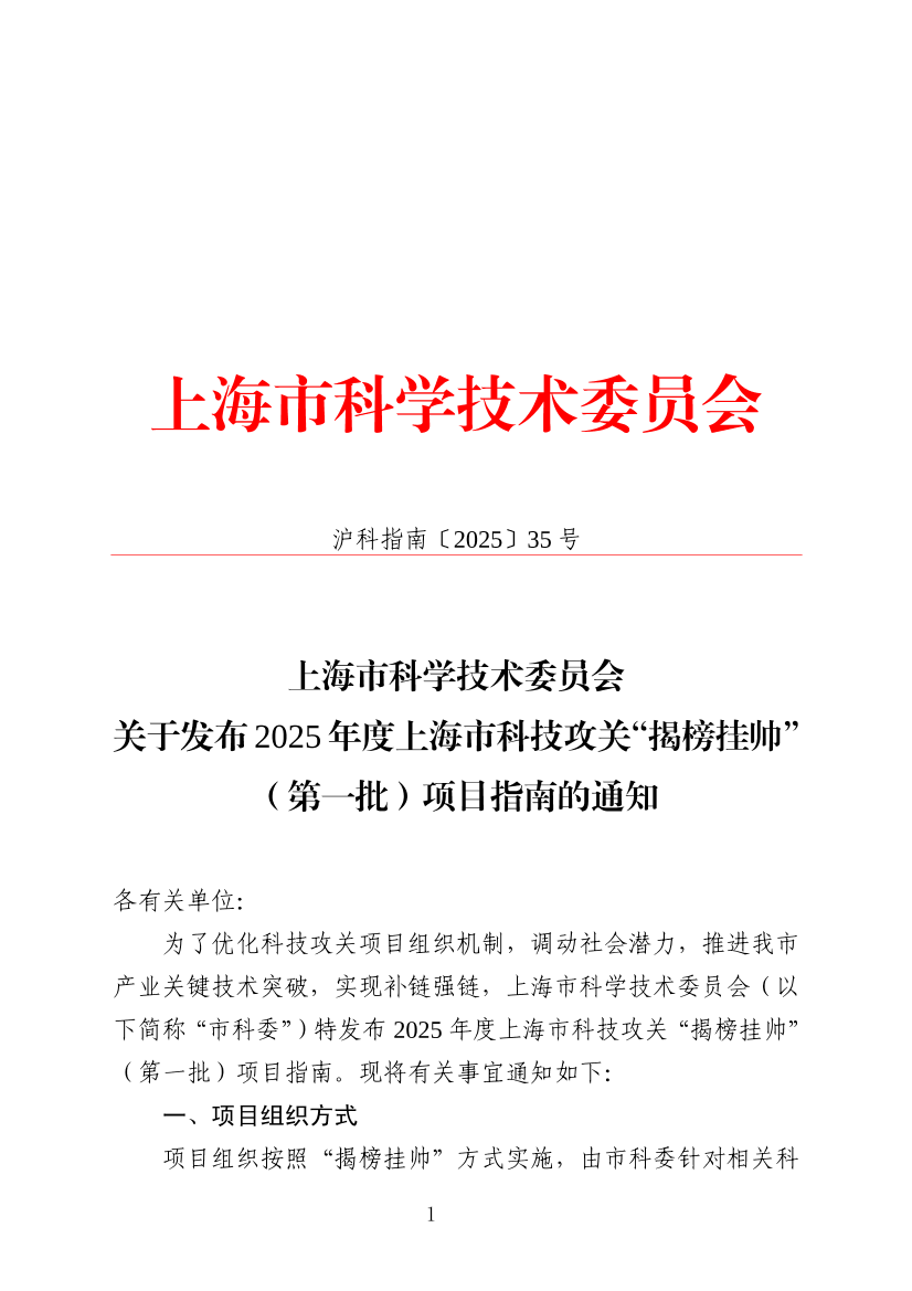 为了优化科技攻关项目组织机制,调动社会潜力,推进我市产业关键技术突破,实现补链强链,上海市科学技术委员会(以下简称“市科委”)特发布2025年度上海市科技攻关“揭榜挂帅”(第一批)项目指南。现将有关事宜通知如下: