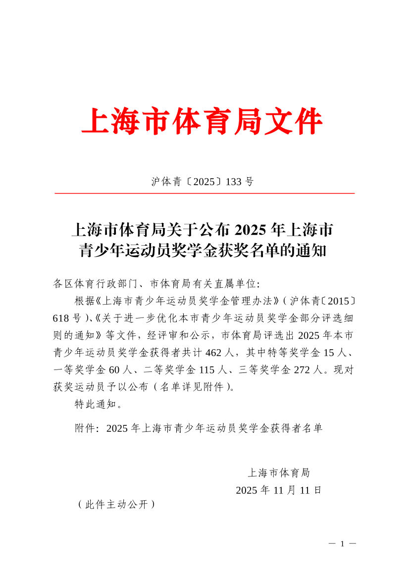 根据《上海市青少年运动员奖学金管理办法》(沪体青〔2015〕618号)、《关于进一步优化本市青少年运动员奖学金部分评选细则的通知》等文件,经评审和公示,市体育局评选出2025年本市青少年运动员奖学金获得者共计462人,其中特等奖学金15人、一等奖学金60人、二等奖学金115人、三等奖学金272人。现对获奖运动员予以公布(名单详见附件)。