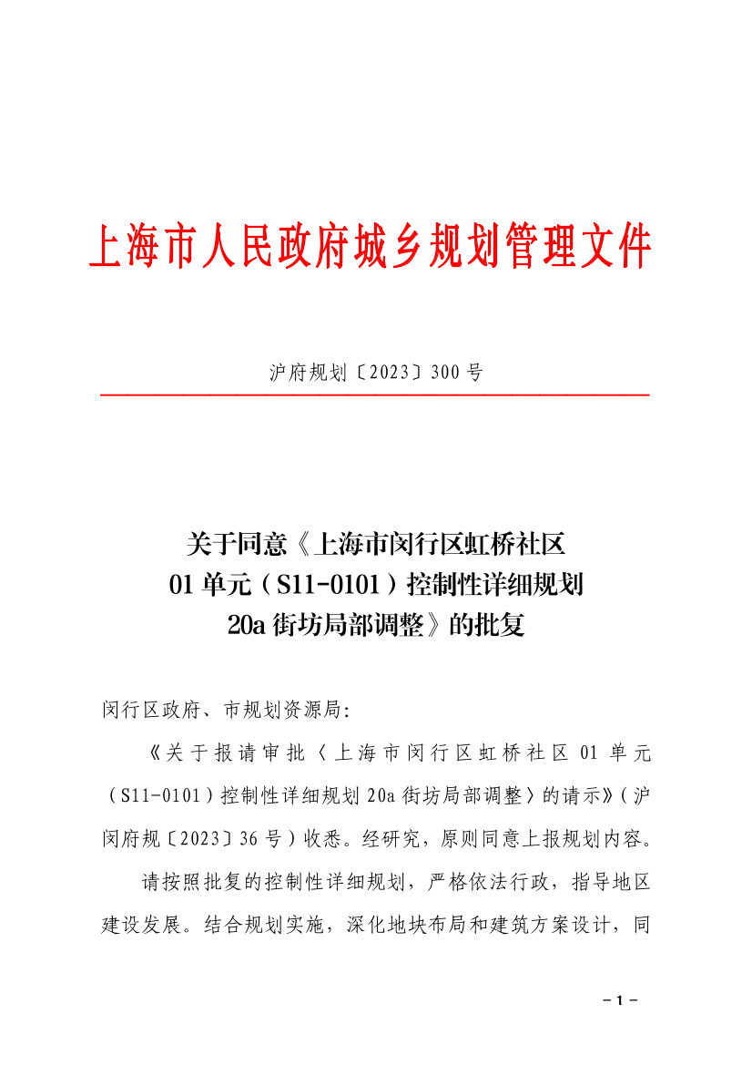 《关于报请审批〈上海市闵行区虹桥社区01单元(S11-0101)控制性详细规划20a街坊局部调整〉的请示》(沪闵府规〔2023〕36号)收悉。经研究,原则同意上报规划内容。