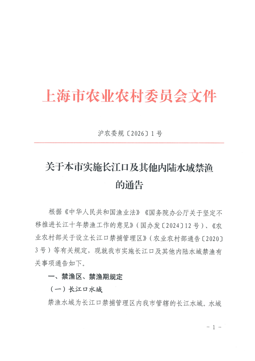 根据《中华人民共和国渔业法》《国务院办公厅关于坚定不移推进长江十年禁渔工作的意见》(国办发〔2024〕12号)、《农业农村部关于设立长江口禁捕管理区》(农业农村部通告〔2020〕3号)等有关规定,现就我市实施长江口及其他内陆水域禁渔有关事项通告如下。