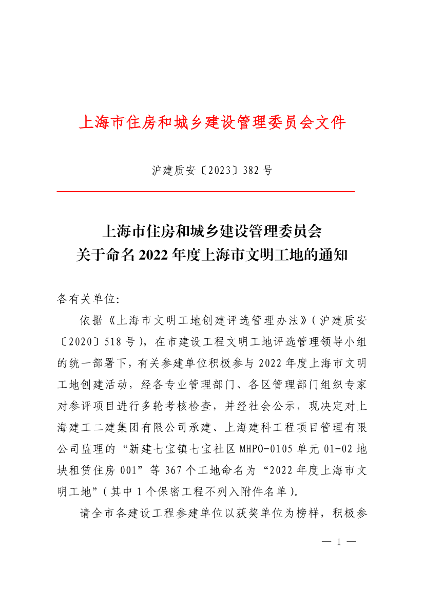 依据《上海市文明工地创建评选管理办法》(沪建质安〔2020〕518号),在市建设工程文明工地评选管理领导小组的统一部署下,有关参建单位积极参与2022年度上海市文明工地创建活动,经各专业管理部门、各区管理部门组织专家对参评项目进行多轮考核检查,并经社会公示,现决定对上海建工二建集团有限公司承建、上海建科工程项目管理有限公司监理的“新建七宝镇七宝社区MHPO-0105单元01-02地块租赁住房001”等367个工地命名为“2022年度上海市文明工地”(其中1个保密工程不列入附件名单)。