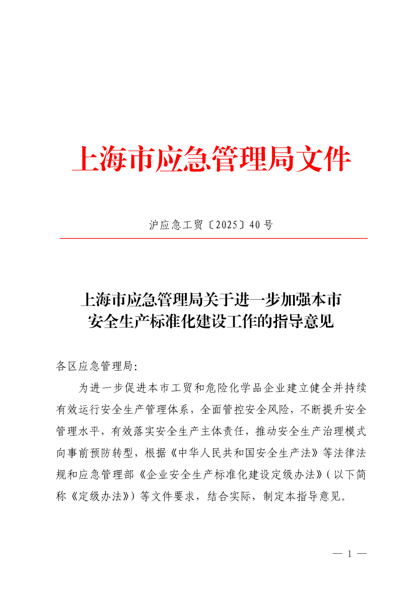 为进一步促进本市工贸和危险化学品企业建立健全并持续有效运行安全生产管理体系,全面管控安全风险,不断提升安全管理水平,有效落实安全生产主体责任,推动安全生产治理模式向事前预防转型,根据《中华人民共和国安全生产法》等法律法规和应急管理部《企业安全生产标准化建设定级办法》(以下简称《定级办法》)等文件要求,结合实际,制定本指导意见。